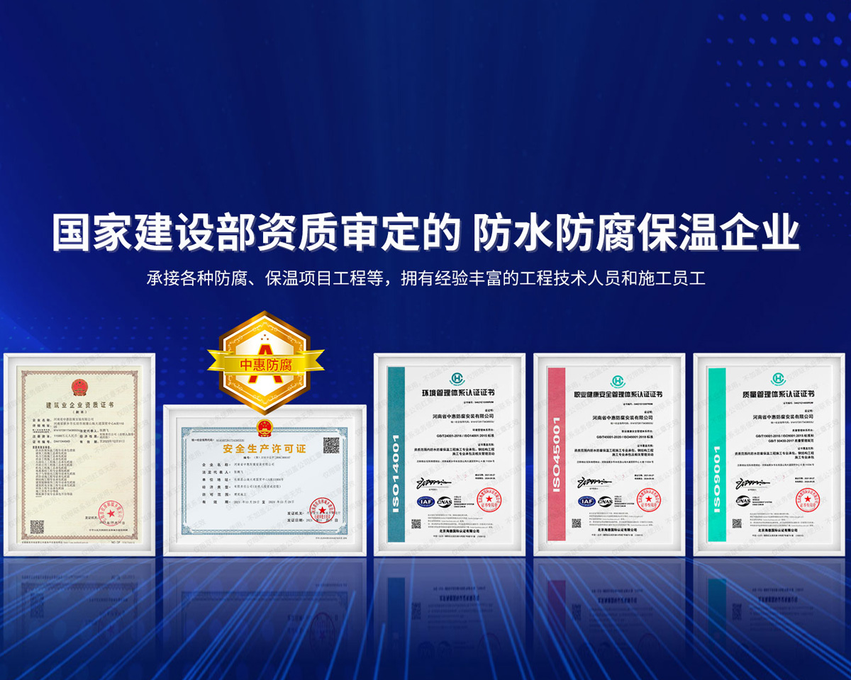 公司經營范圍:防水防腐保溫工程;消防設施工程;建筑裝修裝飾工程;建筑機電安裝工程;電力工程;建筑工程;石油化工工程;工業清洗工程;油罐清洗工程;鋼結構工程;環保工程;模板腳手架工程;電纜防火封堵、防污閃噴涂、外墻外保溫工程;各類施工勞務作業;設備維修、船舶鉚焊、涂裝;電力工程材料、建材、防水材料、防火材料、防腐保溫材料銷售,并相繼通過了GB/T19001-2008idtISO9001:2008GB/T50430-2007質量管理體系認證證書。GB/T24001-2004idtISO14001:2004環境管理體系認證證書。GB/T28001-2011idtOHSAS18001:2007職業健康安全管理體系認證證書。公司是中國防腐蝕于防護協會、中國施工企業管理協會、電力協會和中國鋼結構防水協會會員單位。 公司的經營業務涵蓋了石油、化工、電力、冶金、煤炭、船舶、國防、燃氣、水利、環保、交通運輸、航空及國防軍工和輕紡市政等行業的防腐保溫絕熱設備。鋼結構安裝、防火、防水、金屬噴鍍、聚脲噴繪、陰極保護、防滲透堵漏、玻璃鋼及各種磚版材料襯里、橡膠襯里、煙氣硫和耐酸溶劑腐蝕等工程施工。公司連續十年榮獲“省市先進施工企業”“安全生產先進單位”“重合同,守信用企業”和“AA***資質企業”的稱號。2000年被命名為市級文明單位,2002年被國家工商行政管理局命名為“重合同,守信用的企業”、被中國工業防腐蝕技術協會命名為“防腐蝕企業,能源節約及環境保護領域有豐富的經驗和***的業績。工程一次交驗合格率100%。其中攀枝花鋼鐵公司煉鐵廠四號高爐及熱風爐防腐工程、上海寶鋼公司煤氣柜防腐工程、撫順石油一廠裝置防腐項目、齊魯石化公司稀烴廠高塔防腐工程、吉林化學工業公司煉油廠油罐防腐工程、天津石化熱電廠六號爐頂棚聯絡管保溫工程、大慶油田(太倉)力神泵業工程、中國化學工程第十一建設工程、中原油田勘探局工程、中國石化銷售有限公司華北分部、魯皖輸油管道工程、貴州開磷息烽合成氨工程、陜西黃陵煤化工程、中國石油天然氣西部管道塔里木輸油工程、邯鋼集團邯寶鋼鐵公司煉鐵工程、德州供電工程、吉寶(南通)船廠工程,偃師華潤熱力工程、鄭州熱力總公司。 河南省中惠防腐安裝有限公司愿以豐富的施工經驗,***的技術,***的設備,***的管理,***的服務,竭誠為國內外廣大的用戶提供***滿意、******的工程作品。 我公司愿與國內外同仁一道,團結協作,共同推進防腐蝕行業發展! 公司地址:河南省長垣縣建設路北段360號 固定電話:0373-8866488 郵編:453400 網址:http://www_zhff_com_cn.xg0735.com